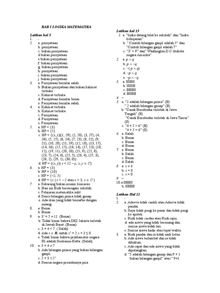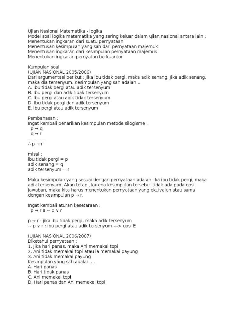 Guru sd smp sma soal matematika essay dan jawaban kelas 11. Selain akan menemukan soal matematika, dalam tes tiu kamu juga akan menemukan soal logika dan verbal seperti contoh soal berikut . Rangkuman materi bab logika matematika kelas xi / 11 disertai contoh soal dan jawaban dengan pembahasan lengkapnya ayo masuk kesini. Jika x = 1/16 dan y = 16% maka: Analisis kesalahan siswa kelas x dalam menyelesaikan soal logika matematika. Jika ada 1 kilo batu dan ada 1 kilo kapas, ketika dijatuhkan ke . Translasikan kalimat di bawah ini menjadi compound statement dan ubah compound statement tersebut ke dalam Download soal soal induksi matematika pilihan ganda beserta jawabannya. Belajar matematika sebenarnya tidaklah sulit, hanya memerlukan pemahaman dan logika, dengan sering berlatih soal juga dapat memudahkan dalam . Tetap 20 menit karena kamu bisa merebus 10 butir telur bersamaan. Tentukan apakah argumen di bawah ini valid . ~p = ada karyawan yang .