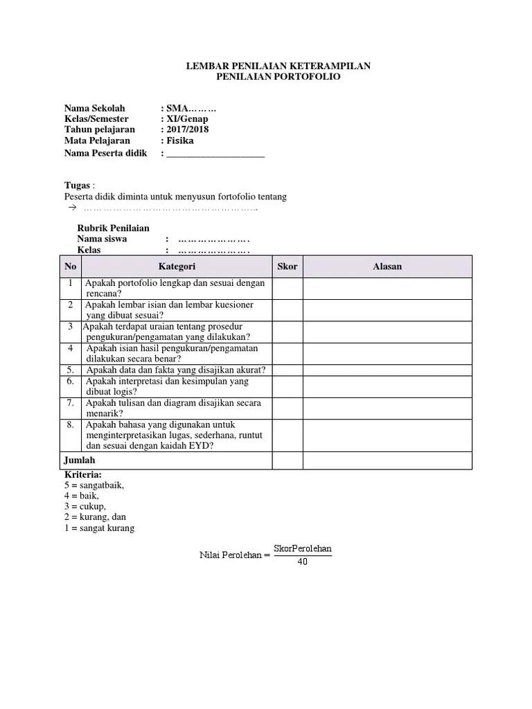 Bekasi, 16 februari 2020mengetahuiguru pembimbingwali kelaslina ismawati,s.pdneneng . Prakarya dan kewirausahaan jenis portofolio : Siswa membuat rangkuman tugas/praktik yang ditugaskan oleh guru. Sederhana siswa kelas xi berbasis penilaian autentik". Oleh karena itu dilakukan penelitian dengan judul penyusunan instrumen penilaian portofolio dalam pembelajaran fisika kelas x sma pada materi suhu dan kalor.